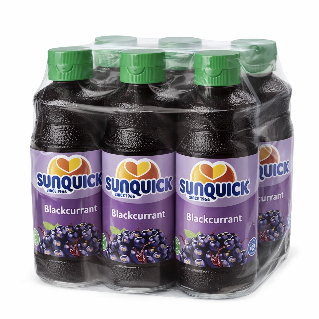 Sunquick Zwarte Bes siroop 700ml. Doos bevat 6 flessen (4,2 liter totaal). Volle bessensmaak, ideaal voor grootverbruik.